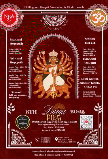 Welcome to Nottingham Bengali Association, a vibrant cultural hub dedicated to promoting Indian traditions, promoting the Hindu ethos and celebrating diversity. Our association is committed to fostering unity through humanity, bringing people from all walks of life together and creating a sense of belonging. Through various religious rituals, cultural events, festivals, and activities, we aim to preserve and showcase the rich heritage of the Bengali community while also embracing the beauty of different cultures. Whether you are Bengali or simply interested in exploring and experiencing the richness of Indian traditions, we wholeheartedly invite you to join us on this incredible journey. Together, we can create a harmonious and inclusive society where everyone feels valued and respected. Join us today and be a part of our thriving community.