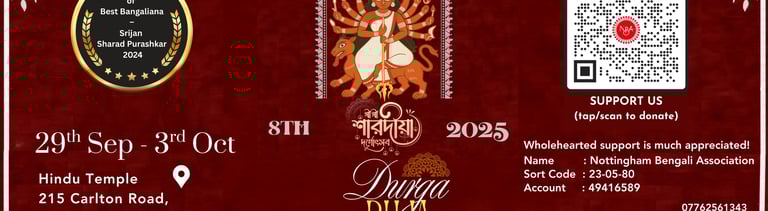 Welcome to Nottingham Bengali Association, a vibrant cultural hub dedicated to promoting Indian traditions, promoting the Hindu ethos and celebrating diversity. Our association is committed to fostering unity through humanity, bringing people from all walks of life together and creating a sense of belonging. Through various religious rituals, cultural events, festivals, and activities, we aim to preserve and showcase the rich heritage of the Bengali community while also embracing the beauty of different cultures. Whether you are Bengali or simply interested in exploring and experiencing the richness of Indian traditions, we wholeheartedly invite you to join us on this incredible journey. Together, we can create a harmonious and inclusive society where everyone feels valued and respected. Join us today and be a part of our thriving community.